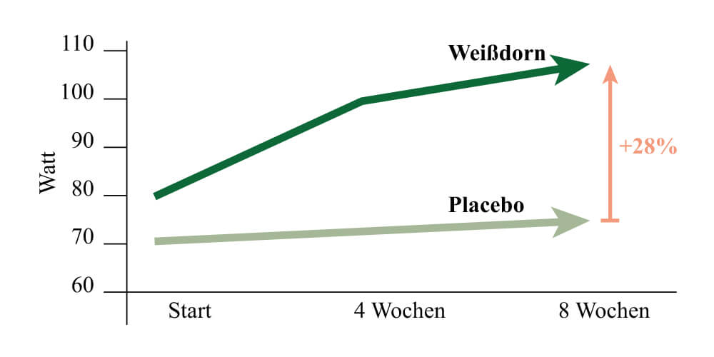 Versuchsreihe*: 78 Probanden erhielten Weißdorn oder Placebo. Die Personengruppe mit dem Weißdornpräparat steigerte die Leistung auf dem Fahrradergometer nach 56 Tagen auf 107 Watt und somit gegenüber der Placebogruppe um 28%.